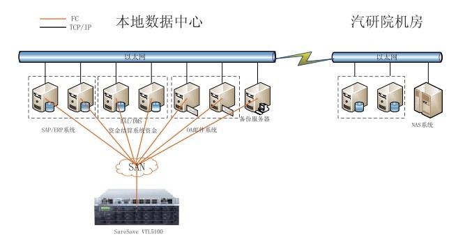本方案部署SureSave VTL3000针对本地和远程机房进行集中备份管理,配置2个并行控制器,满足大数据量备份的性能需求;16个独立的4GB/s光纤通道分别连入近10个不同的SAN存储区域网,无需额外连接光纤交换机,实施维护简便。